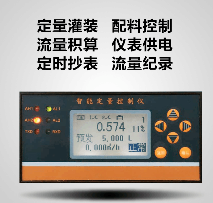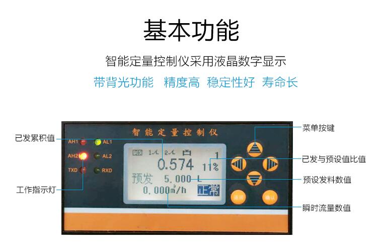 4、定量控制儀顯示參數(shù)包括本次累積、總累積、瞬時流量、時間、流量計輸入信號值等;