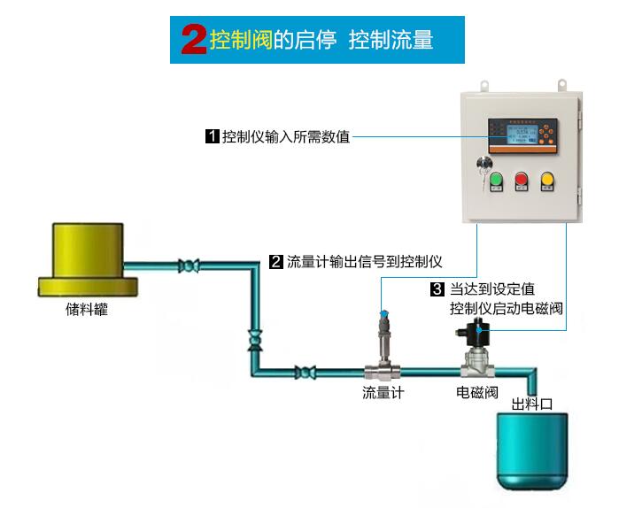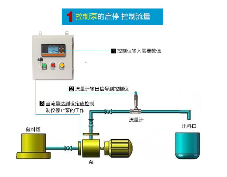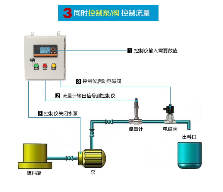 通過流量計測量流量 ,控制儀表接收信號,在控制儀表里設(shè)置定量值。定量值達(dá)到后電磁閥、水泵 斷電停止工作。