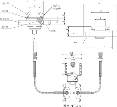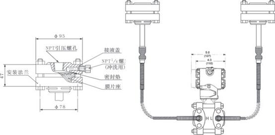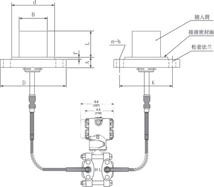 AK-3051DP雙法蘭液位變送器是一種通過安裝在管道或容器上的遠(yuǎn)傳裝置來感受被測壓力,該壓力經(jīng)毛細(xì)管內(nèi)的灌充硅油(或其它的液體)傳遞至變送器的主體,然后由變送器主體內(nèi)的δ室和放大線路板,將壓力或差壓轉(zhuǎn)換4~20mA.DC信號輸出(參見結(jié)構(gòu)原理圖)。 |