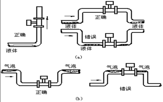 7. 測量液體時,為了保證管內(nèi)充滿液體,所以在垂直或傾斜管道安裝儀表時,應(yīng)該保證液體流動方向從下而上。若管道內(nèi)含少量氣體,為了防止氣體進入儀表測量管,儀表應(yīng)安裝在管線的較低處。