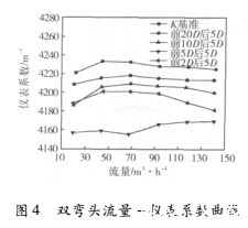 圖4為雙彎頭流量-儀表系數(shù)曲線。