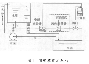 實(shí)驗(yàn)是在天津大學(xué)天津市過程參數(shù)檢測與控制重點(diǎn)實(shí)驗(yàn)室的水流量標(biāo)準(zhǔn)裝置上完成的,實(shí)驗(yàn)管徑為100mm,圖1為實(shí)驗(yàn)裝置示意圖。